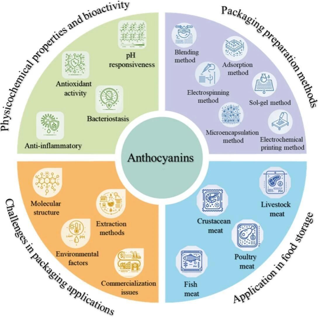 文章指出,传统食品包装难以同时满足新鲜度监测、抗菌保鲜和环境友好等多重要求,而花色苷天然具备pH响应变色、抗氧化和抑菌等多功能特性,在智能活性包装中展现出独特优势。文章系统总结了花色苷在不同食品体系(如肉类、水产、禽类及甲壳类制品)中的实际应用案例,归纳其在可视化腐败指示、保质期延长、微生物污染抑制等方面的作用机制和表现性能。在材料制备方面,文章详细评述了共混、吸附、溶胶-凝胶、静电纺丝、电化学印刷、微胶囊化等六类主流制备策略,分别分析其工艺原理、响应性能、稳定性与应用适配性,并引用大量最新研究成果进行比较归纳。例如,静电纺丝制备的花色苷基纳米纤维膜可在10秒内响应pH变化,远优于传统流延膜的反应速度(15–40分钟),在实时鲜度监测中展现出显著优势。此外,文章还重点剖析了花色苷稳定性差、高成本提取、难以规模化等产业化瓶颈问题,并从分子结构修饰、绿色提取溶剂(如天然深共熔溶剂DES)、共色增强机制与智能标签集成等方向提出了针对性解决策略。文章特别指出,诸如金属有机框架(MOFs)、纳米纤维、可降解高分子等新材料与花色苷复合使用,有望显著提升其响应精度与环境稳定性,为多功能可降解智能包装的开发提供了可行路径。该综述不仅总结了近两年的相关文献,还通过跨数据库文献溯源回顾了1988年以来的关键研究与技术演化脉络,具有较强的系统性与前瞻性。