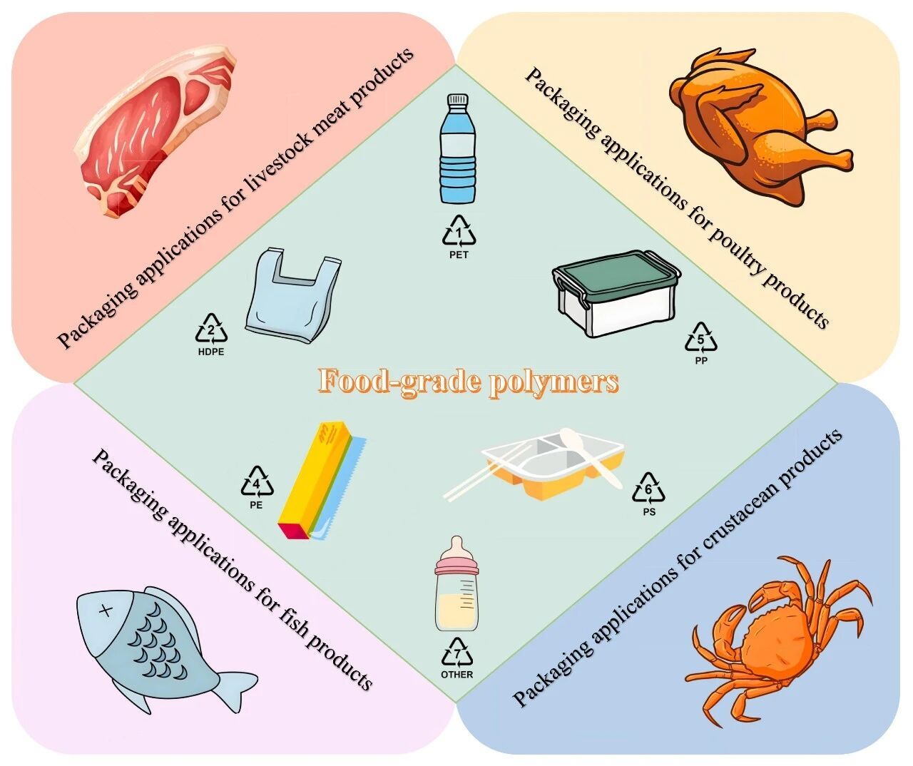 Fig. 4. Common food-grade plastics and applications of anthocyanin-based intelligent packaging in different food storage.