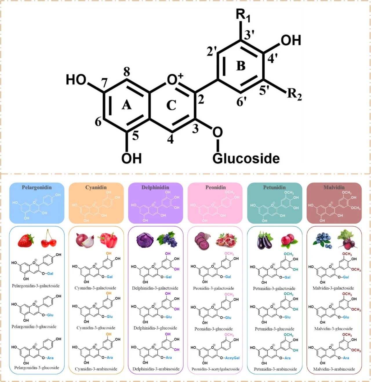 Fig. 1. Basic skeleton of anthocyanins and chemical structures of six common anthocyanidin aglycones and their glycosides.