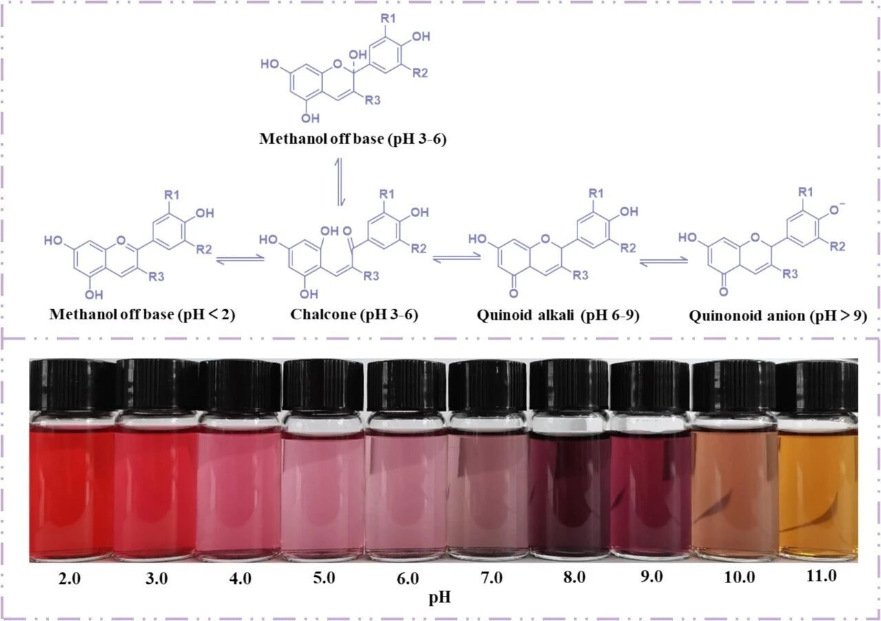 Fig. 2. Configurational and color changes of anthocyanins in different pH values.