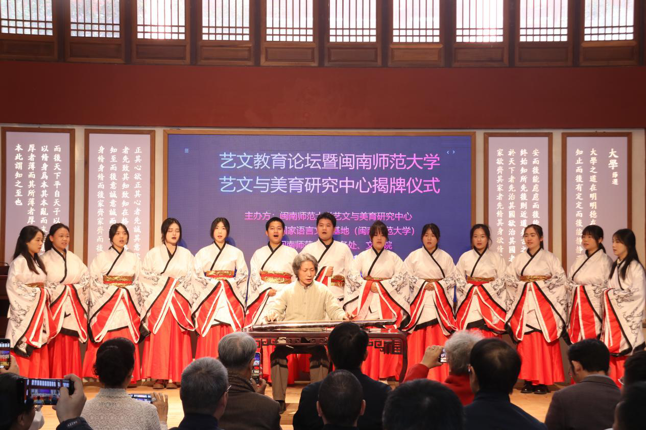 闽南师范大学党委常委、副校长张龙海,福建省美学学会会长、福建师范大学教授伍明春,以及龙人古琴创始人谢建东先生在开幕式上致辞。张龙海副校长表示,闽南师范大学始终致力于将美育融入人才培养,艺文与美育研究中心的成立将为学校进一步挖掘闽南文化精髓、传承与弘扬中华优秀传统文化提供平台。。